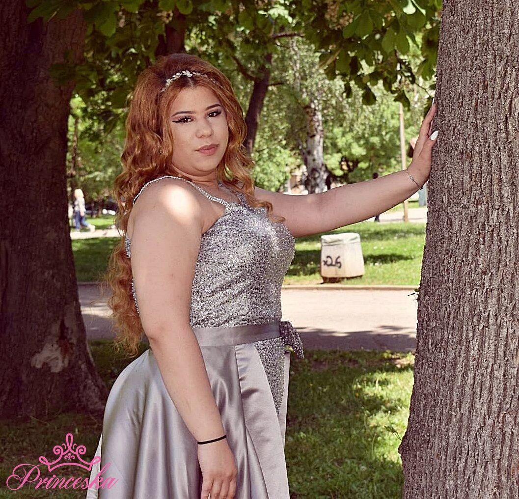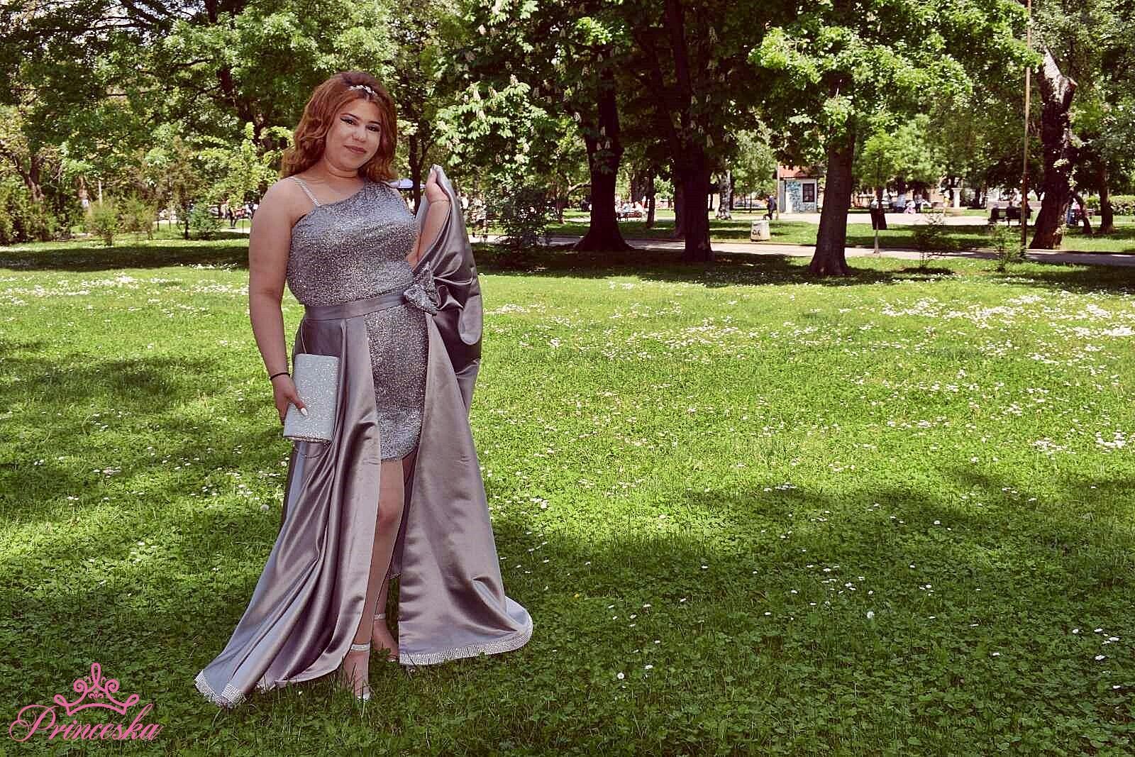 Описание: Стилна дълга бална рокля изработена от блестящо ламе с шлейф от италиански сатен в модерно сиво. Модела е изработена в макси размер.
